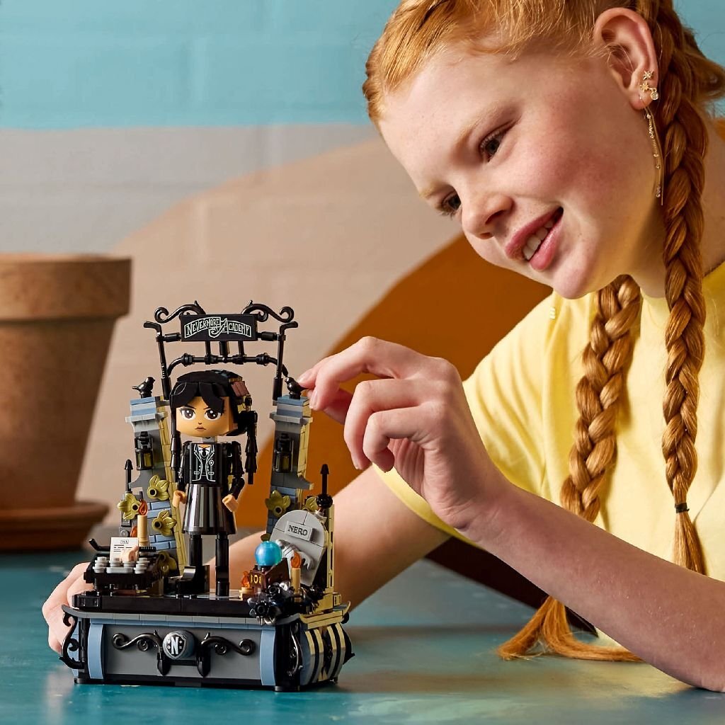 Een verstelbaar verzamelmodel met beweegbaar hoofd, armen en voeten, plus 2 gezichten en 2 outfits voor Wednesday. De set is inclusief haar trouwe assistent Thing, een standaard met zwarte dahlia’s en 2 verborgen ruimtes om spulletjes in op te bergen, zoals de Rave’N Dance-jurk of haar uniform. Met de poort van de Nevermore Academy en Wednesday’s accessoires, waaronder haar typemachine, Nero’s graf, een kristallen bol en meer. Ontdek andere Lego Wednesday sets (apart verkrijgbaar) voor nog meer speelmogelijkheden. Dit model is ook een cool verjaardagscadeau voor kinderen. Een digitale versie van de bouwinstructies is te vinden in de Builder app. Er is ook een sticker met een QR-code voor de achterkant van de displaybasis, waarmee fans gemakkelijk toegang krijgen tot de digitale instructies om de outfit van Wednesday te veranderen. Met de app kunnen kinderen inzoomen, hun modellen draaien in 3D en meer. 702-delig. Geschikt voor kinderen vanaf 10 jaar.